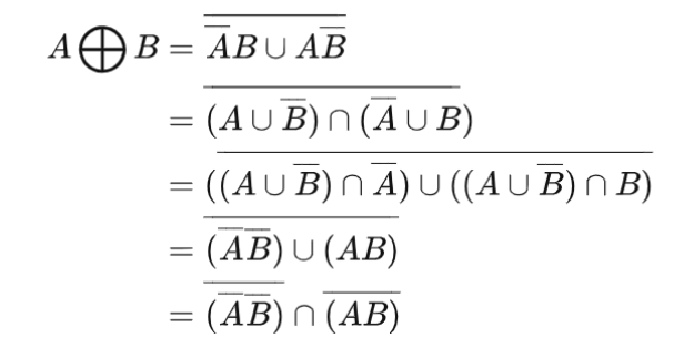 1 2 3 4 5 6 7 8 9 10 11 int bitXor (int x, int y) { return ~(~x & ~y) & ~(x & y); }
